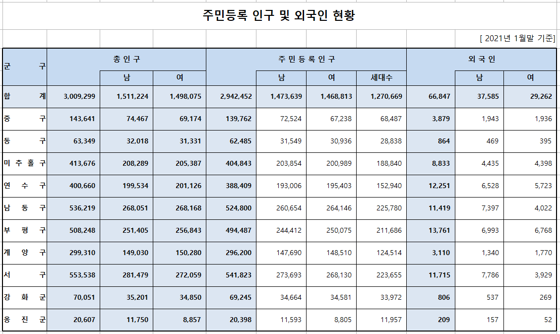 2021년 인천시 총 인구수는 294만 8375명을 기록했습니다. 인구 증가세는 수도권 지리적 요인이 영향을 미쳤다는 분석입니다. 서울과 경기도 집값이 크게 상승했기 때문인데요. 서울과 가까운 인천에 집을 마련한 수요가 늘었다고 합니다. 인천은 자족도시 특징을 가지고 있어 인구 유출이 적기도 하다고 합니다.