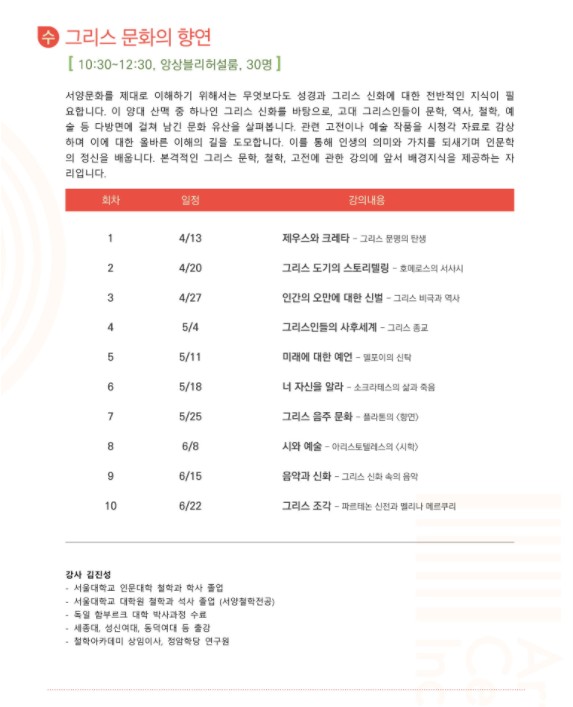 서양문화를 제대로 이해하기 위해 필요한 그리스 신화에 대한 문학, 역사, 철학, 예술 등 다방면에 걸쳐 남긴 문화유산을 살펴볼 수 있는 그리스 문화의 향연