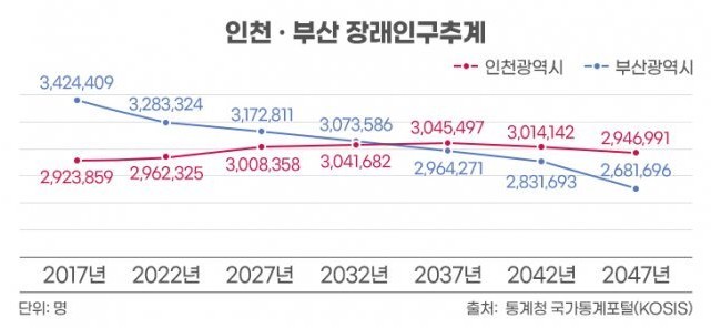 장래인구추계를 보면 인천시 인구수 전망은 오는 2027년 인구 300만 명을 돌파하고 2034년 305만 명으로 부산시 인구를 넘어설 것으로 예측하고 있습니다.